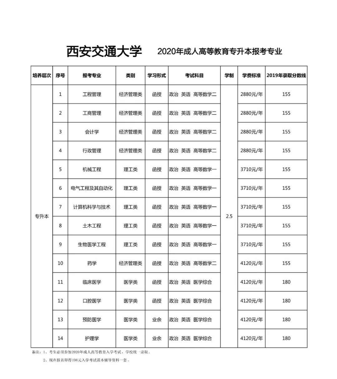 专升本:工商管理、行政管理、机械工程、土木工程、电气工程及其自动化、药学、口腔医学、护理学等;